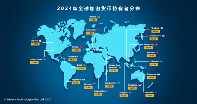 Triple-A 估计,2024 年全球加密货币持有者达到 5.62 亿人,约占全球人口的 6.8%,较 2023 年增长 34%。